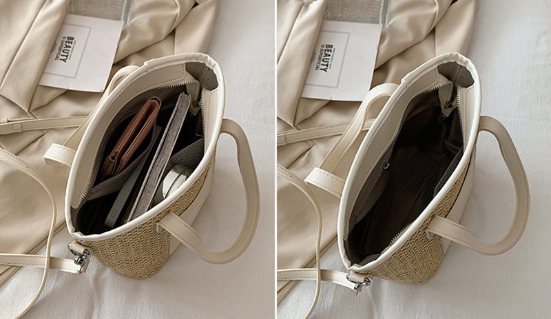 Med sin alsidige størrelse på 20x12x28 cm er denne smarte raffia-taske perfekt til ferier og dagsture og passer perfekt til ethvert sommeroutfit, fra shorts og toppe til lange kjoler. Lynlåslukningen holder dine ejendele sikre, mens skulderremmen i pu-læder tilføjer et ekstra strejf af elegance.