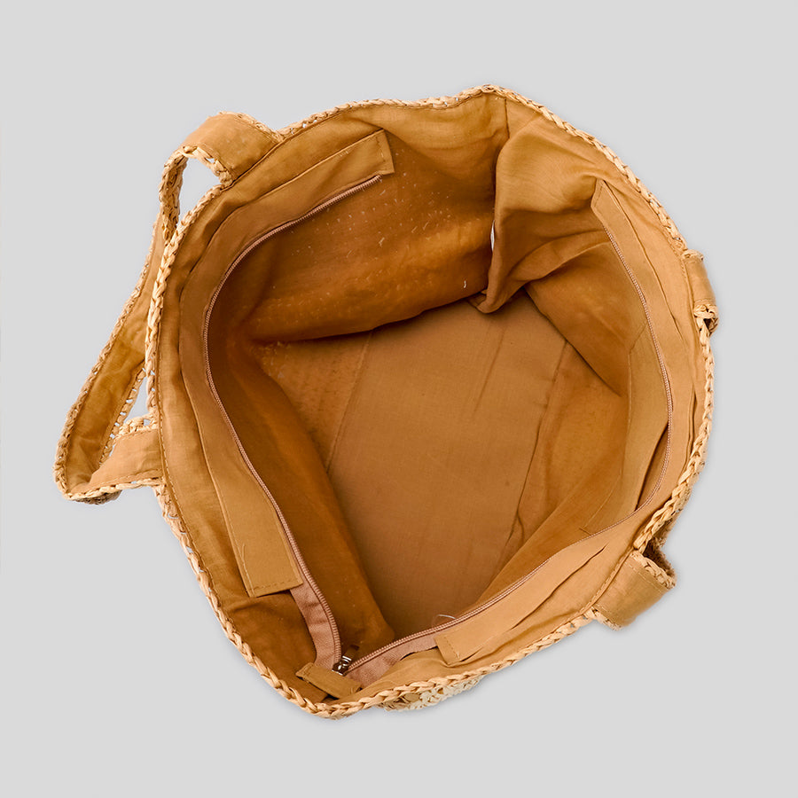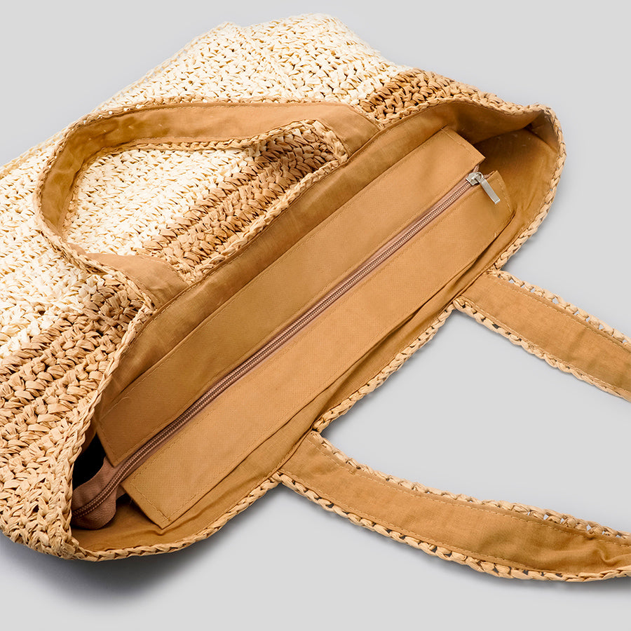 - En tidløs strandtaske af høj kvalitet i strå og polyester.